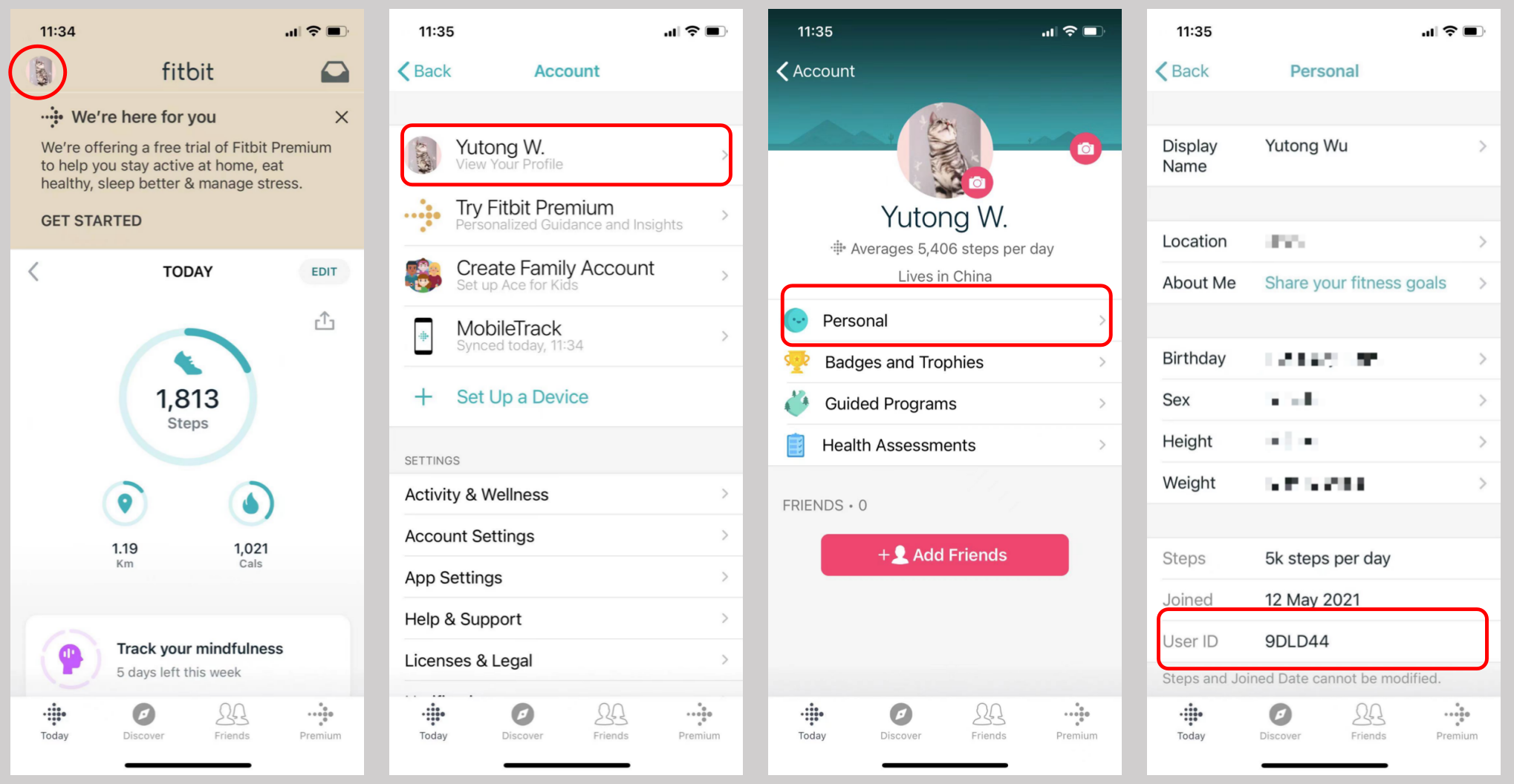 Launch your Fitbit app (make sure you're using the latest Fitbit app version), click your Fitbit avatar in the top left corner, then click your Fitbit display name to view your profile. Then Click "Personal" and go to the next page, your Fitbit User ID is located at the bottom.