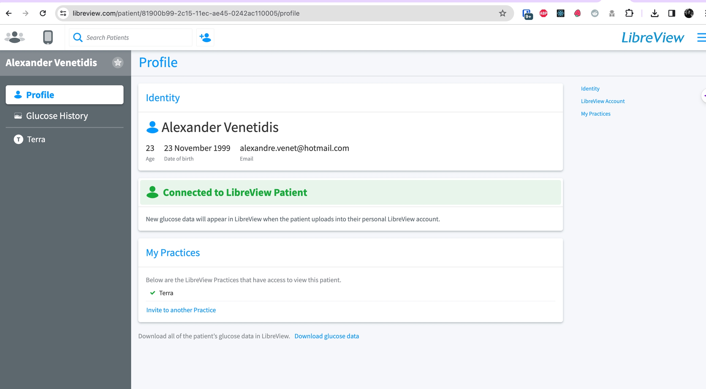 If we have connected your users to your own LibreView practice, you may simply substitute provider_user_id with the one retrieved from the REST API Endpoints endpoint and visit the link above. You'll then be able to see the user's account email, name, and data present on their account, by clicking on the "Glucose History" tab.