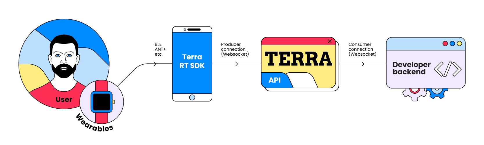 Device Connection: The user connects their wearable device to your mobile app via Bluetooth Low Energy or ANT+, using one of Terra's real-time streaming SDKs.